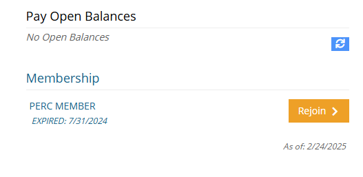 To the far right, you will find a "Pay Open Balances" and "Membership" section. Below the "Membership" section, you will see the expiration date of your membership and an option to "Pay" or "Rejoin," see examples below.