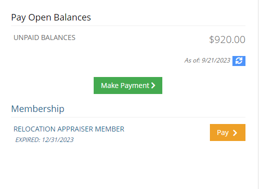 If your membership has expired, you may remit your renewal fee by selecting the "Pay" or "Rejoin" button. If you have several line items in your membership, you may pay by selecting the green "Make a Payment" button under the "Pay Open Balances" section and select which items you would like to pay for at this time.